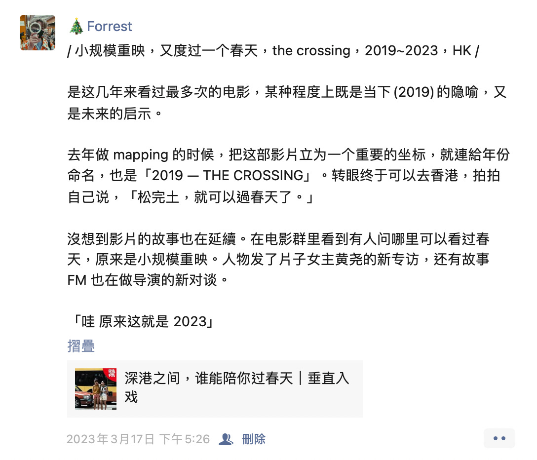 另一方面,如果說對香港電影和 2019 社運的好奇心,更多是一種想要嘗試站在香港的視角去了解對岸的故事。那麼《過春天》就彷彿給我一種試圖找到自己座標的可能性 —— 畢竟這部片子的另一個名字是 The Crossing。